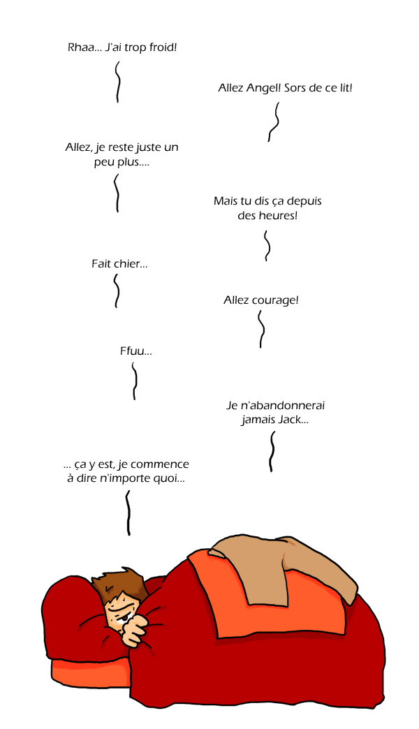 Grrr… Je déteste être malade, surtout avec de la fièvre. Ça me file des courbatures, je tremble comme une feuille et j’arrive pas à sortir de mon lit! J’ai bien tenté une sortie dans l’après-midi, mais j’ai fini tout habillé sous la couette jusqu’à tard dans la nuit!