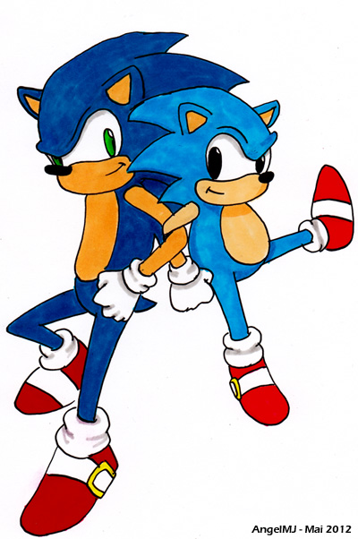 Enfin… on peut toujours bidouiller par la suite sur l’ordinateur mais j’avais envie de vous servir un dessin « brut », à l’ancienne. J’ai juste trafiqué la couleur du Sonic « Moderne » car même après plusieurs touches de Pantone, je n’arrivais pas à l’assombrir assez.