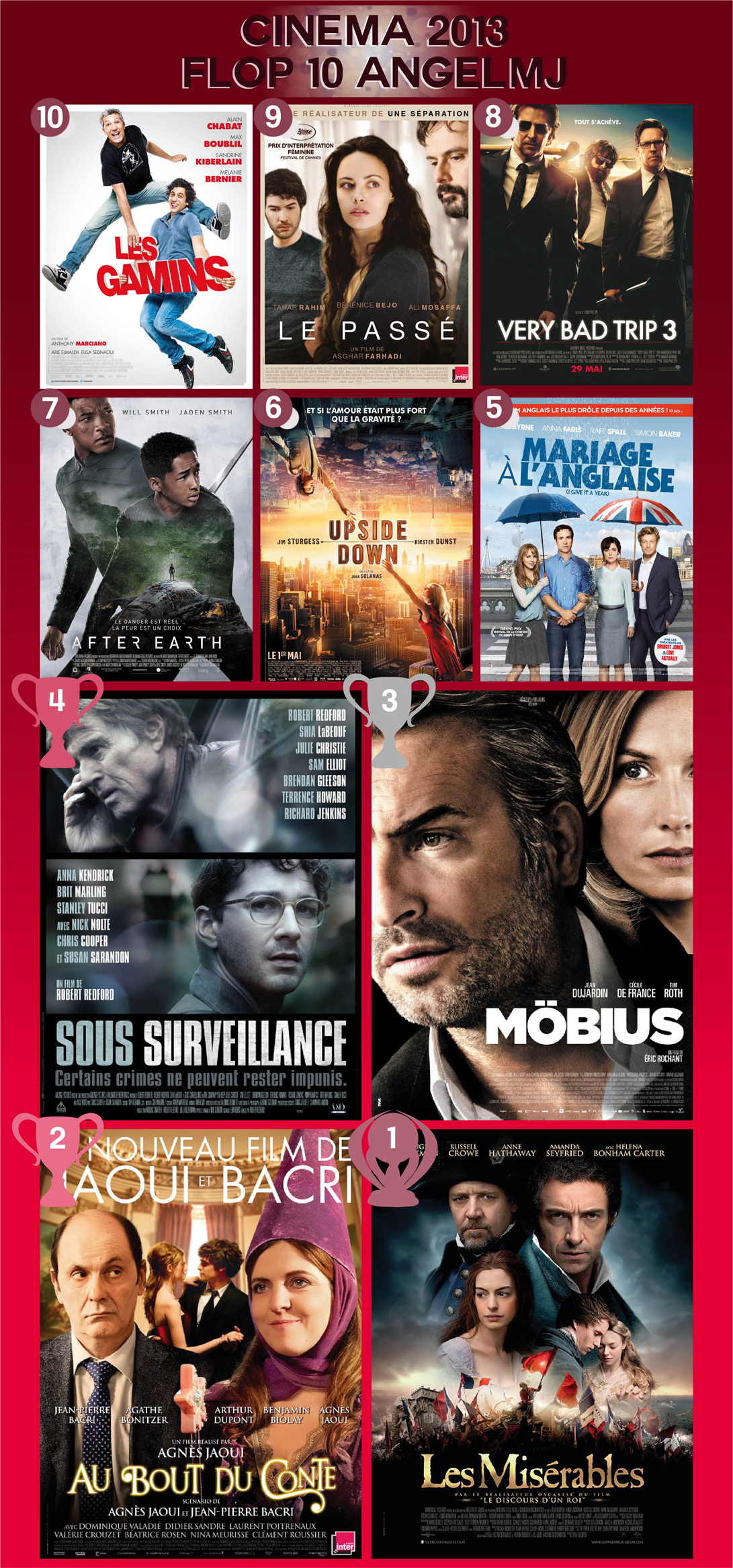 105. C’est le nombre exact de films que j’ai vu sur grand écran en 2013. C’est mon record, je ne sais pas si je le renouvellerai, mais je ne vais pas au cinéma pour ça non plus! Et avant de commencer à vous parler des films de 2014, j’avais envie de vous exposer mon Top/Flop 10 de l’année 2013. C’est bien sûr hyper subjectif, mais sinon quel intérêt de faire ce genre de Top. Il faut savoir que je note tous les films que j’ai vu dans un petit classeur Excel (oui, ça fait un peu psychopathe mais bon…) et que mon classement est composé de 3 sous-catégories : les films que j’ai aimé (55 films), ceux que j’ai trouvé moyen ou sans plus (31 films), et enfin ceux que je n’ai pas aimé (19 films). Mon Top 10 est donc logiquement composé des dix premiers films de j’ai aimé et mon Flop 10 des 10 derniers que je n’ai pas aimé. Vous êtes prêts? C’est parti!