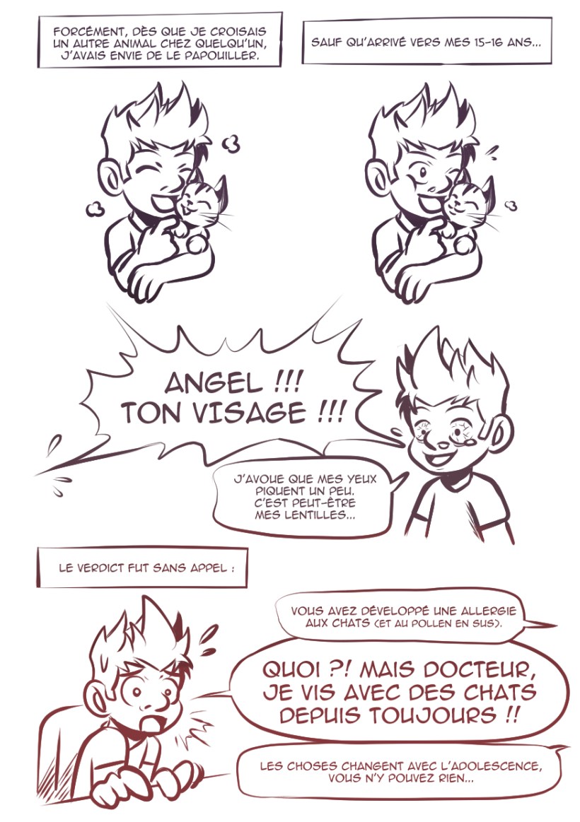 Je suis allergique aux poils de chats, allergie détectée à mes 16 ans alors que mes parents avaient un chat (un vieux chat) d’ailleurs avant de partir de la maison, il en avait deux, parce qu’ils avaient recueilli un chaton de 4 semaines. Malheureusement mon homme est encore plus allergique que moi, alors qu’on voulait adopter un chat de refuge, on a craqué sur la vieille toutoune du coin: Laika vielle berger allemand de 12 ans. Maintenant elle en a 14 et je regrette pas du tout.