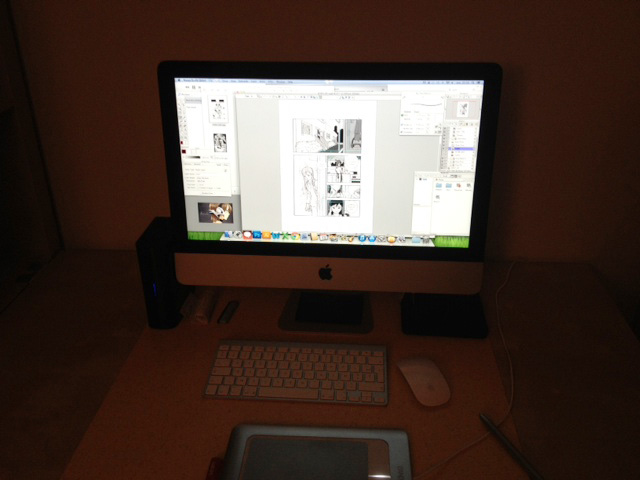 Je me rends compte que faire une planche de BD, même en noir et blanc, ça prend quand même vachement plus de temps qu’une simple illustration ou un dessin! Pas vraiment au niveau des personnages, mais plutôt au niveau de la mise en scène et des décors! Car oui, je découvre à force d’avancer que je suis une quiche pour faire des bâtiments! Arf! Donc il faudra être indulgent sur les premières planches, ça s’améliorera avec le temps (j’espère).