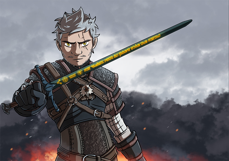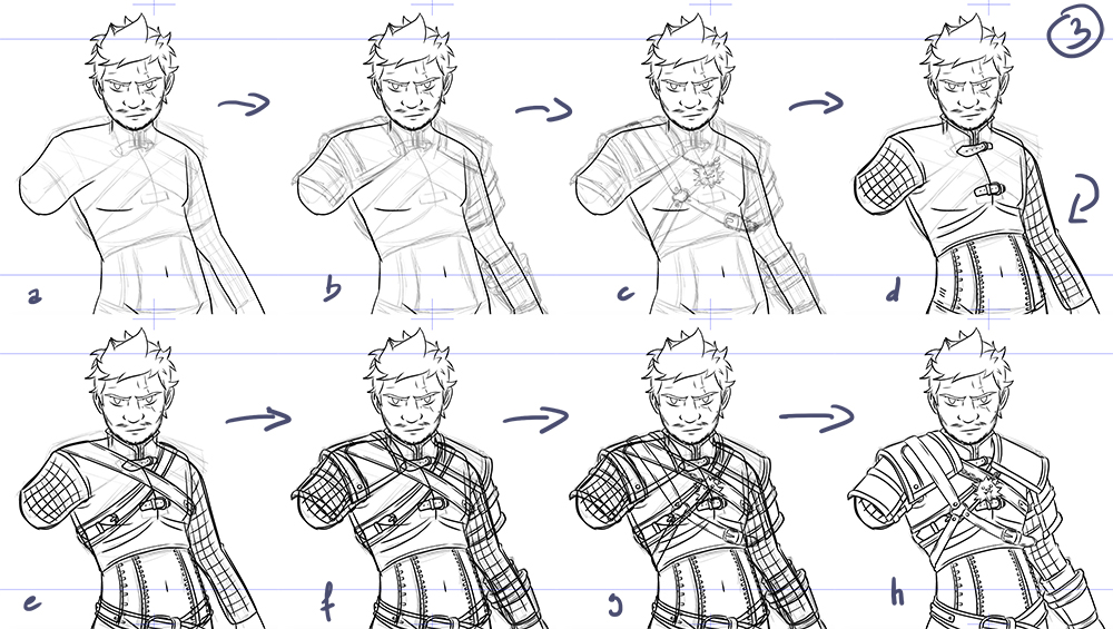 A l’occasion de son anniversaire, j’ai voulu faire plaisir à Mathieu en l’habillant comme le héros de The Witcher. Cependant, l’armure de notre cher Geralt est relativement complexe (même s’il y a pire). J’ai donc procédé par étapes : j’ai fait un croquis séparé pour chaque « couche » d’armure (par séparé, j’entends sur des calques différents). Ensuite, j’ai encré chaque croquis sur le même principe. Il n’y a plus qu’à mettre des masques entre chaque calque pour que tout se superpose de manière harmonieuse (les masques, c’est la vie, si vous faites de l’illustration sur informatique, vous ne pouvez pas vous en passer).