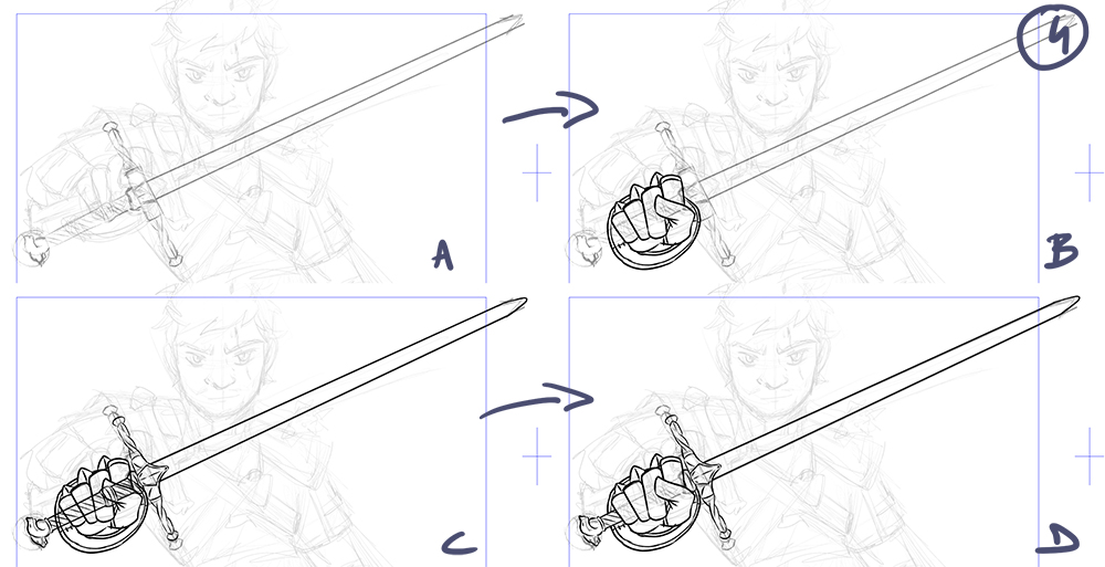 Certains petits malins ont sans doute remarqué que, jusqu’à présent, notre pauvre Mathieu ne disposait que d’un moignon à la place de son bras droit (spéciale dédicace à un certain LANNISTER). C’est normal vu que la main tenant l’épée est dessinée sur un autre calque. Ici, même opération que pour l’armure : je fais un calque pour la main et un calque pour l’épée (j’ai en profité pour apprendre quelques règles sur la taille des gardes par rapport à celles des lames, c’est toujours ça de pris). Un masque et le tour est joué.