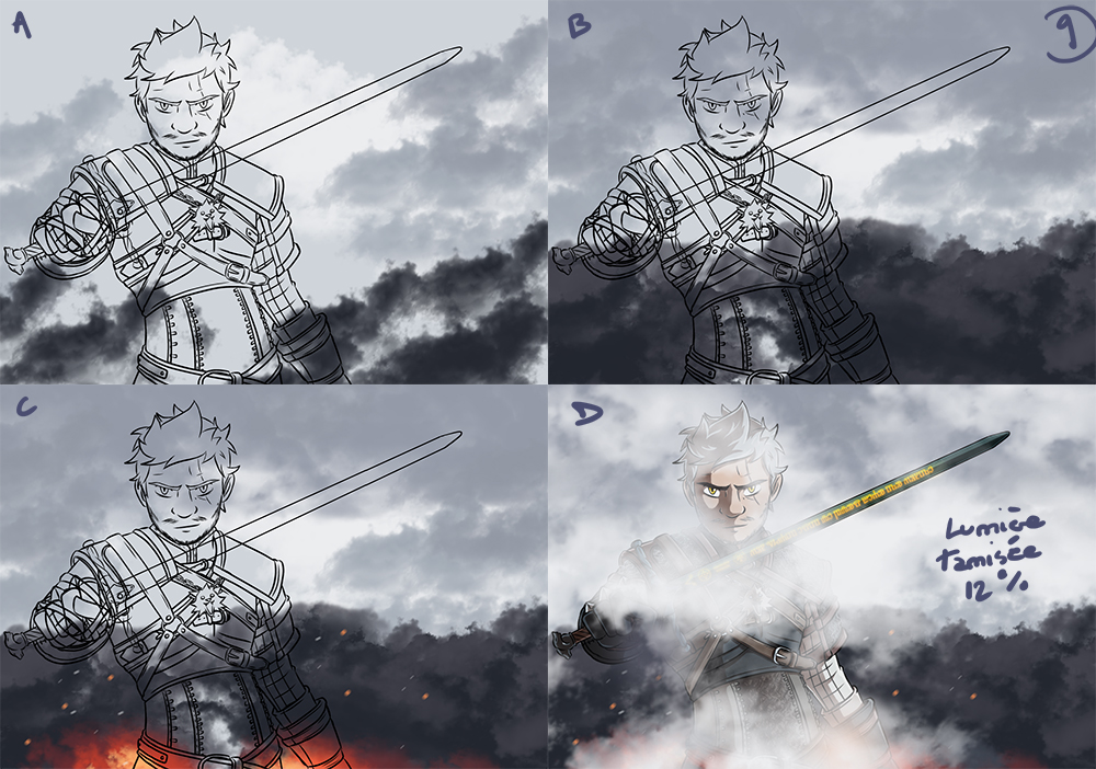Et voilà le résultat final. J’espère que ce petit step by step vous a plu. Pour rappel, j’utilise Manga Studio (appelé maintenant Clip Studio Paint) pour l’encrage et Photoshop pour la mise en couleurs et les effets. Au niveau du temps, je pense qu’il m’a fallu 4-5 heures pour réaliser ce dessin, en sachant que j’ai recommencé l’armure deux fois. En tout cas, j’ai beaucoup aimé ce projet que je considère comme une nouvelle étape-clé dans mes progrès avec les outils numériques. J’espère donc ne pas m’arrêter en si bon chemin.