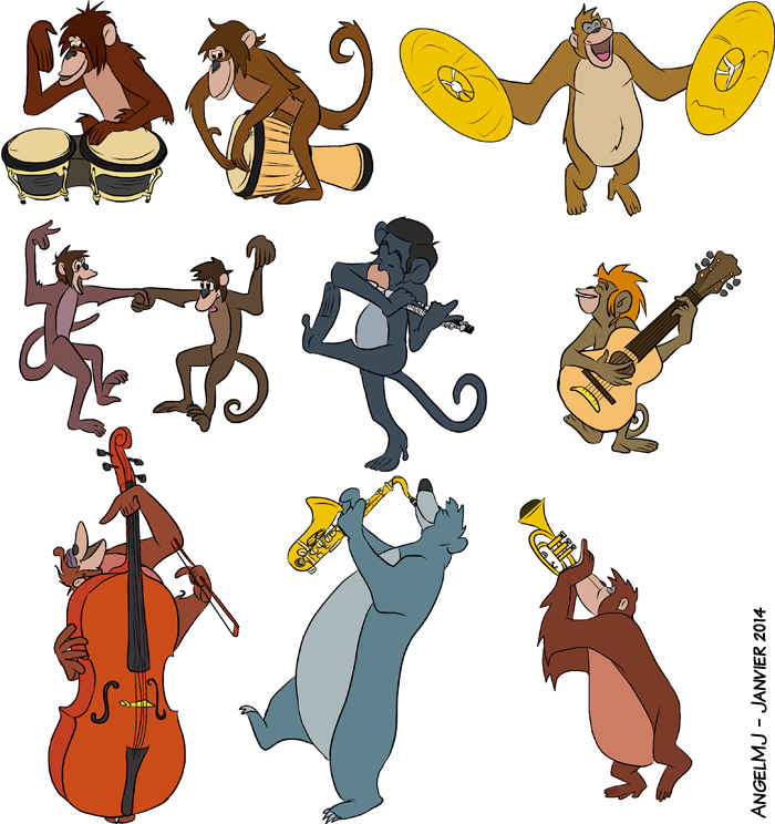C’était en tout cas un travail intéressant car il m’a permis de dessiner autre chose que des personnages. Pour les singes, c’était assez amusant à faire car je ne décide pas souvent d’animaux. Cela m’a permis à passage de revoir Le Livre de la Jungle que je n’avais pas vu depuis longtemps (et j’ai eu la chanson du Roi Louie dans la tête pendant une semaine aussi…). Quant aux instruments, j’ai été surpris par la complexité des détails sur certains d’entre eux, plus particulièrement les flûtes et les cuivres! Une belle expérience en tout cas (même si j’ai du souvent me coucher tard pour tout boucler à temps!).